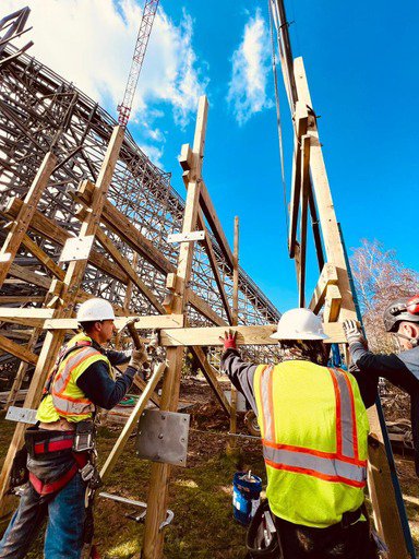 Installé au centre de la cour, un sapin géant de 13 mètres de haut surplombe la maison du Père Noël dans un décor à ciel ouvert.